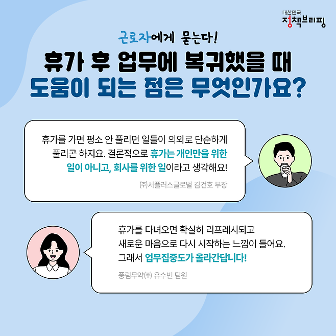 - 휴가를 다녀오면 확실히 리프레시되고 새로운 마음으로 다시 시작하는 느낌이 들어요. 그래서 업무집중도가 올라간답니다!