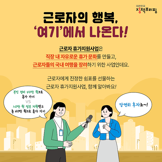 지금부터 직장인들의 워라밸을 위한 '근로자 휴가지원사업'에 대해서 알아보겠습니다.