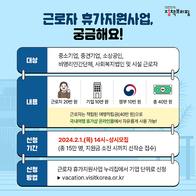- 신청방법 : 근로자 휴가지원사업 누리집에서 기업 단위로 신청