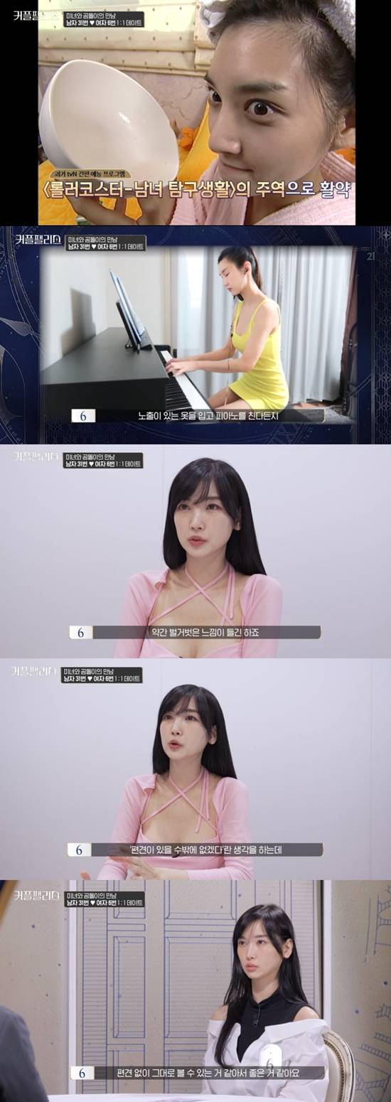 여자 6번은 tvN '롤러코스터-남녀 탐구생활'에서 '꽃사슴녀'로 인기를 끌었던 이해인이었다. 현재는 134만 구독자를 보유한 유튜브 채널 '이지'를 운영 중이다. 노출 있는 옷을 입고 피아노를 치는 이색 콘텐츠로 인기를 끌고 있다.