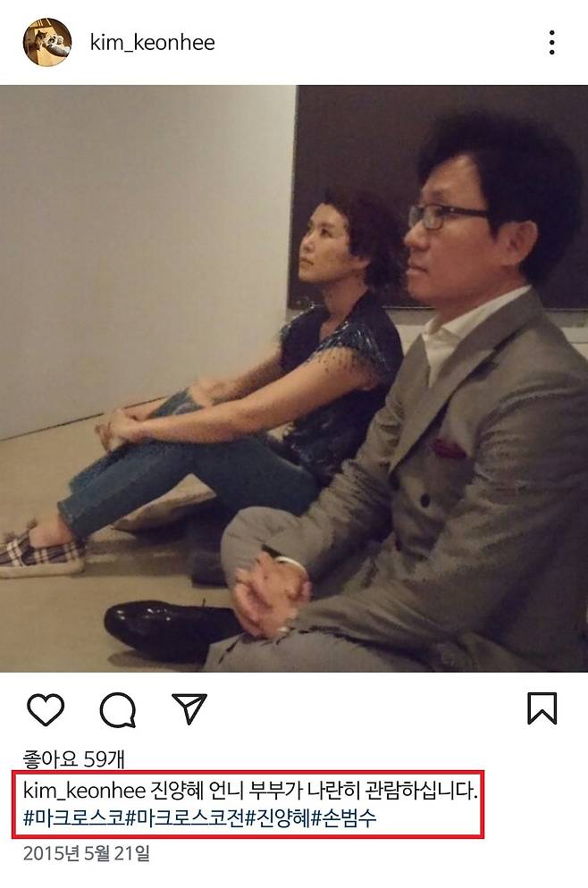 | ▲ 김건희 여사는 2015년 5월 21일 인스타그램에 진양혜 아나운서 부부가 '마크 로코스' 전시전을 관람하는 사진을 올리며 "진양혜 언니 부부가 나란히 관람하십니다"라고 친분을 과시했다. |