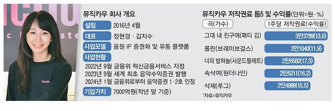 정현경 뮤직카우 대표(사진)는 최근 매일경제와 인터뷰하면서 "그동안 쌓아온 노하우를 바탕으로 고객에게 더 매력적이고 가치 있는 음악수익증권을 선보일 것"이라며 이같이 말했다.