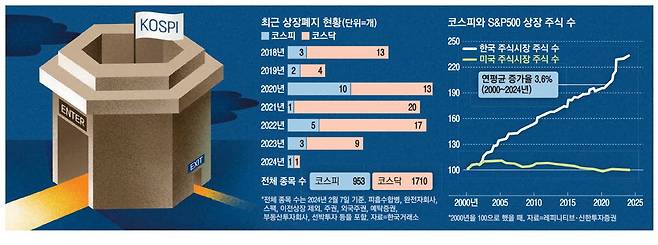 7일 매일경제가 한국거래소로부터 받은 자료에 따르면 2018년부터 국내 코스피 종목 가운데 상장폐지된 종목은 25개에 불과하다. 코스피 종목 수가 이날 기준 953개에 달하는데, 연평균 상장폐지되는 종목은 4개(약 0.4%)에 불과하다는 이야기다.