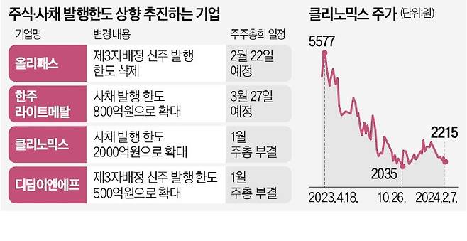 주주들은 기업의 무분별한 주식 발행 한도 상향 움직임에 반발하고 있다. 주주 반대로 정관 변경이 무산된 사례도 있다. 클리노믹스는 1월 주총에서 CB·BW 등 사채 발행 한도를 각각 900억원에서 2000억원으로 늘리려고 했으나 주총에서 부결됐다. 작년 3월 정기주총에서 신주 발행 한도를 발행주식총수의 100분의 20에서 100분의 50으로 바꾼 지 1년 만에 또 한도를 늘리려고 하자 주주들이 반대한 것이다. 클리노믹스는 작년 7월 276억원 규모의 일반공모 증자를 실시한 데 이어 150억원 규모 제3자배정 유상증자를 추진하고 있다. 유상증자 발표 후 주가는 5000원대에서 2000원대 초반까지 추락했다. 소액주주와 경영권 분쟁을 벌이고 있는 디딤이앤에프 역시 제3자배정 유상증자 한도를 기존 발행주식총수의 100분의 30에서 500억원으로 변경하려 했으나 1월 주총에서 무산됐다.