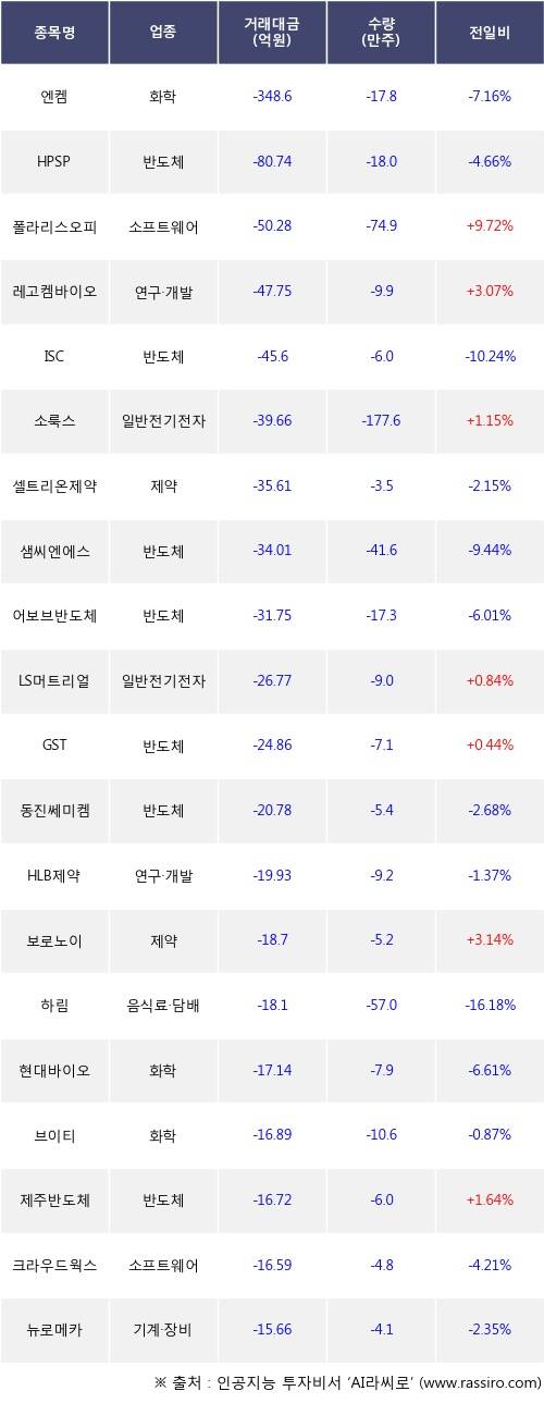 외국인 투자자의 순매도 상위 20개 종목은 엔켐, HPSP, 폴라리스오피스, 레고켐바이오, ISC, 소룩스, 셀트리온제약, 샘씨엔에스, 어보브반도체, LS머트리얼즈등이다.