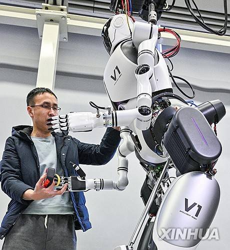 (240207) -- BEIJING, Feb. 7, 2024 (Xinhua) -- A researcher adjusts a humanoid robot at an AI laboratory on Jan. 31, 2024.