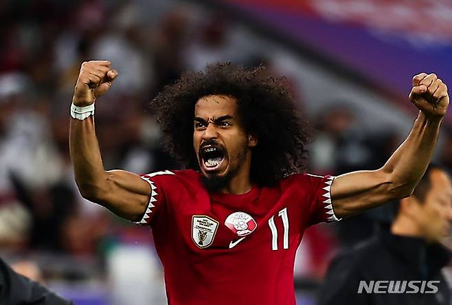 [도하(카타르)=뉴시스] 김근수 기자 = 7일(현지시간) 카타르 도하 알투마마 스타디움에서 열린 아시아축구연맹(AFC) 2023 카타르 아시안컵 4강전 이란 대 카타르의 경기에서 카타르가 3:2으로 승리를 거두고 결승에 진출했다. 카타르 아크람 아피프가 기뻐하고 있다. 2024.02.08. ks@newsis.com