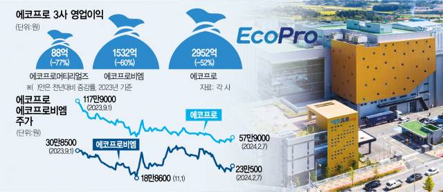 에코프로(086520) 3형제(에코프로·에코프로비엠(247540)·에코프로에이치엔(383310))가 지난해 4분기 부진한 실적을 거뒀지만 하락세를 지속하던 주가는 급등했다. 미국 증시에서 테슬라를 비롯한 전기차 관련주가 반등한 데다 에코프로가 액면분할 등 주주 친화 정책을 발표한 점이 상승의 원동력이 됐다. 다만 전기차 시장이 캐즘(혁신 제품이 대중화되기 전 겪는 일시적 판매 정체) 구간에 진입한 만큼 지속적인 상승세를 타기까지는 시간이 필요할 것이라는 전망이 나온다.