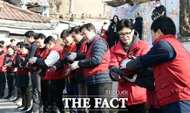 [더팩트ㅣ이새롬 기자] 한동훈 국민의힘 비상대책위원장이 설 연휴를 하루 앞둔 8일 오전 서울 노원구 중계동 백사마을을 찾아 연탄 배달을 하고 있다.