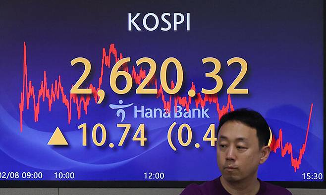 | 뉴욕發 낭보에 코스피도 ‘방긋’ 하나은행 직원이 8일 서울 중구 명동 본점에서 증시와 환율을 모니터링하고 있다. 이날 코스피는 전 거래일보다 10.74포인트 오른 2620.32로 장을 마쳤다. 코스닥 지수는 전 거래일보다 14.66포인트 상승한 826.58에 거래를 종료했다. 뉴시스 |