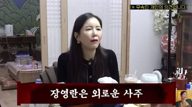 이어 무속인을 찾아간 장영란은 “제가 딱 들어왔을 때 기운은 어땠나?”라고 질문했고 무속인은 “셌다. 막 무섭고 이런 센 게 아니라 나를 지키려고 하는 게 굉장히 세기 때문에 그 에너지를 끝까지 유지를 해야 한다”라고 말했다. 이어 “본인이 굉장히 외로운 사주다. 주변에 사람이 없고 이런 게 아니라 자수성가를 해야 된다”라고 덧붙였다.
