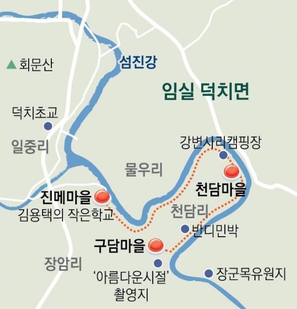 구담정이 있는 언덕에 오르면 당산나무 아래로 굽이치는 섬진강 물줄기가 펼쳐진다. 이곳에서 이광모 감독의 영화 ‘아름다운 시절’(1998년)을 촬영했다. 한국전쟁 직후 어려운 시절을 살아가는 사람들의 이야기를 그린 작품이다.