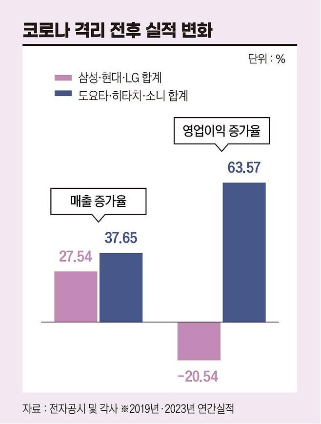 2019년 현대자동차와 도요타의 매출과 순익 차이는 각각 200조원과 20조원이었다. 반면 올해에는 매출과 순익 격차가 270조원과 30조원까지 벌어질 것으로 보인다. 한·일 1등 기업인 삼성전자와 도요타자동차의 격차도 벌어졌다. 2022년 도요타와 삼성전자의 매출 격차는 약 30조원까지 좁혀졌다. 하지만 2023년은 170조원까지 벌어질 전망이다.