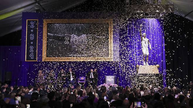 미국 ESPN에 따르면 LA 레이커스는 캘리포니아주 LA의 크립토닷컴 아레나 외부에 크기 약 5.8m, 무게 약 1.8t의 브라이언트 청동 동상을 공개했습니다.