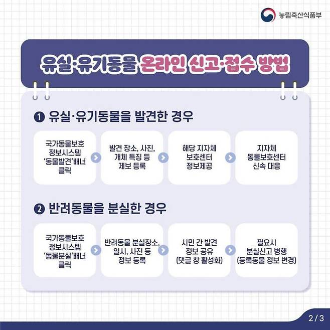 농식품부에 따르면 연휴 기간 떠돌아다니는 유실·유기 동물을 발견한 경우 국가동물보호정보시스템(www.animal.go.kr)에 접속해 우측 배너 '동물 발견'을 통해 발견 장소, 동물의 종류 등을 기입해 촬영한 사진과 함께 신고하면 됩니다.