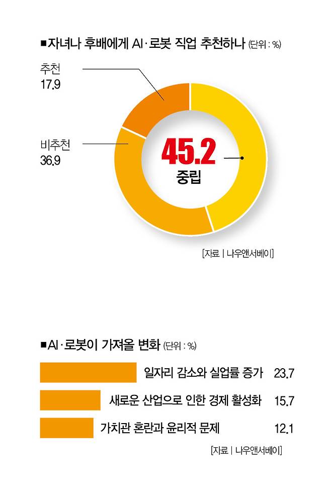 인공지능(AI)과 로봇은 이제 산업현장에서 쉽게 찾아볼 수 있는 도구다. 엘림넷 나우앤서베이가 직장인 1000명을 상대로 '자녀나 후배에게 AIㆍ로봇 관련 직업을 추천하고 싶은지'를 물어본 결과, 추천하겠다는 응답자는 17.9%에 그쳤다. 추천하지 않겠다는 응답자는 2배 높은 36.9%에 달했다.