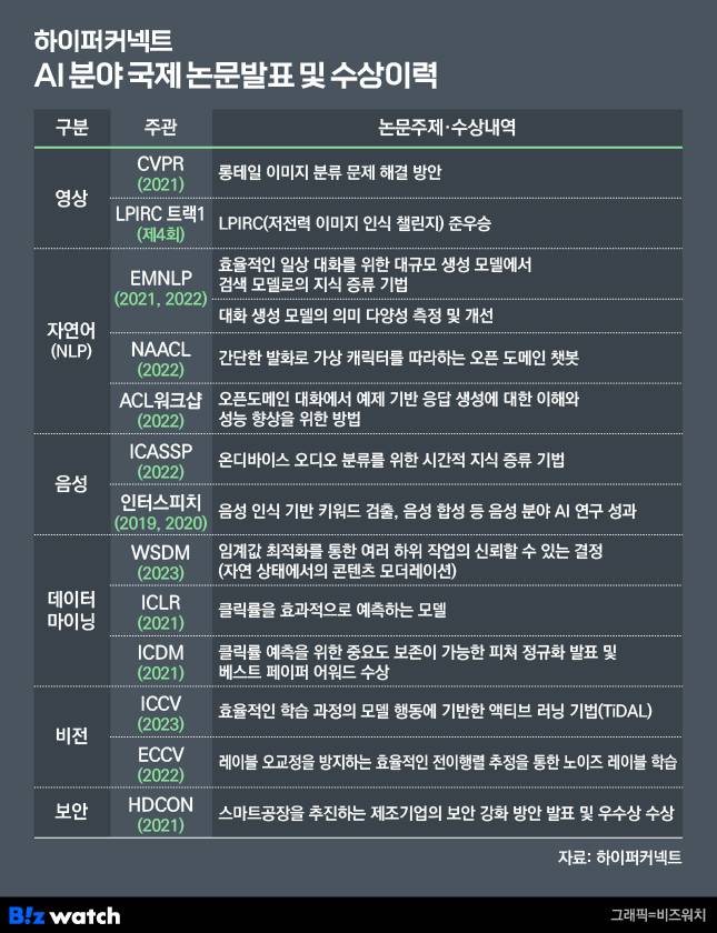 이같은 노력은 성과로 이어졌다. 실제 하이퍼커넥트는 현재까지 'CVPR'(컴퓨터 비전 및 패턴 인식 학회), 'EMNLP'(자연어처리 국제 학회)를 비롯한 국제 학회에서 논문 15편을 발표하고, 50개 이상의 AI 모델을 실제 서비스에 상용화하는 성과를 이뤘다. 틴더, 힌지 등 글로벌 서비스를 운영하는 매치그룹과 기술 협업도 활발하게 벌이고 있다.