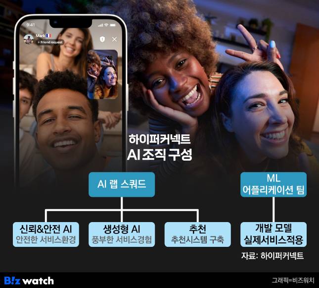 특히 하이퍼커넥트는 설립 초기부터 AI 조직을 꾸려 관련 기술을 연구하고 제품 서비스에 적용하는 작업을 지속하고 있다. 현재 이 회사 AI 조직은 △Trust & Safety(신뢰&안전) AI △Generative(생성형) AI △Recommendation(추천) 등 3개의 'AI랩 스쿼드'와 ML(머신러닝) 애플리케이션 팀으로 구성돼있다. 세계적 학회에 다수의 논문을 발표하는 저력도 갖췄다. 한마디로 AI를 통한 대전환 곧, 'AX'가 조직에 체화된 기업이라고 볼 수 있다.