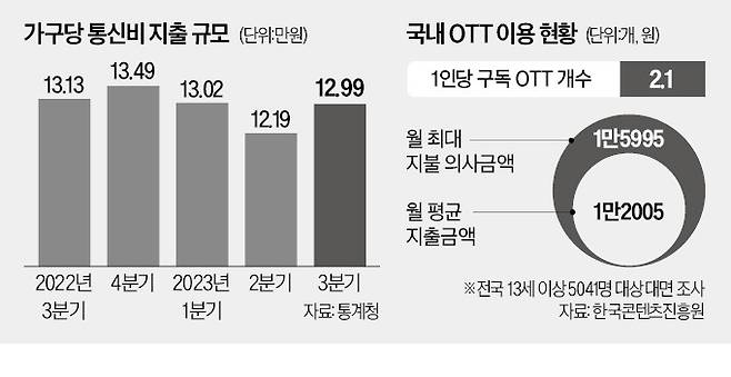 12일 업계에 따르면 내년엔 통계청 분류상 가구당 통신비가 14만원대로 치솟을 전망이다. 통계청이 내년부터 통신비를 정보통신비로 이름을 바꿔 OTT 구독료까지 편입하기로 해서다. OTT 구독료는 그동안 문화서비스로 분류돼 왔다.