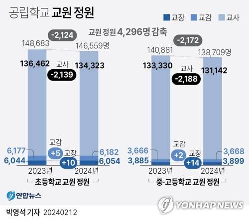 (서울=연합뉴스) 박영석 기자 = 12일 관가에 따르면 정부는 초·중등 공립학교 교원 정원을 4천296명 감축하는 내용의 '지방교육행정기관 및 공립의 각급 학교에 두는 국가공무원의 정원에 관한 규정' 일부 개정령안에 대한 입법예고를 최근 마쳤다.