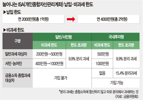 “납입 한도가 연 2000만원(총 1억원)에서 연 4000만원(총 2억원)으로 늘어난다. 비과세 한도도 만기 때 이익과 손실을 통산한 순이익 200만원(서민·농어민형 400만원)에서 500만원(서민·농어민형 1000만원)으로 확대된다.