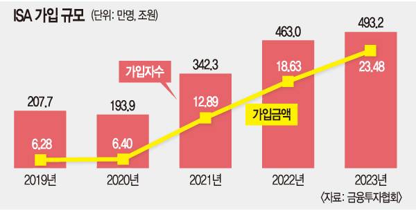 금융투자협회 통계에 따르면 신탁형과 일임형 ISA 가입자 수(105만여명)를 합쳐도 중개형 ISA 가입자 수(383만여명) 절반에 못 미친다. (지난해 11월 말 기준)”