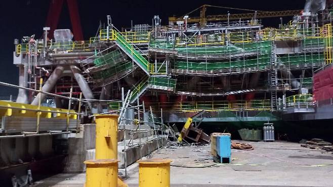 오늘 (12일) 저녁 6시 50분쯤 울산 동구 HD현대중공업 해양공장에서 원유생산설비 블록 이동 작업 도중 철제 구조물이 빠지는 사고가 났습니다.