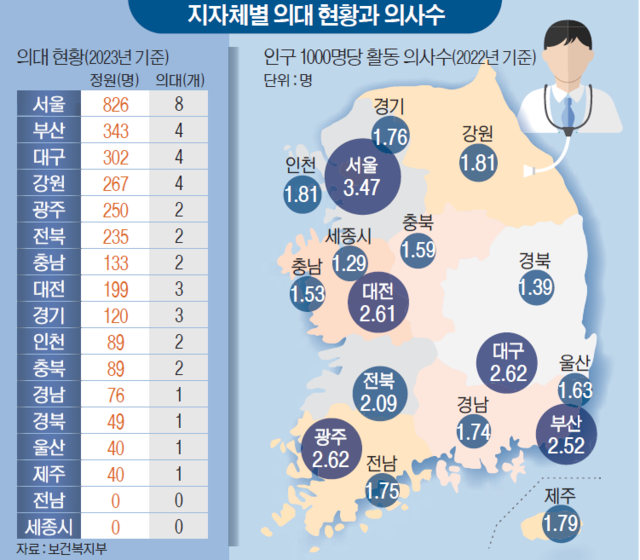 비수도권지역에 의료인력 양성 거점인 의대가 없거나 적다는 것도 고질적 문제다. 복지부에 따르면 2023년 기준 서울에 있는 8개 의대의 입학 정원은 826명이지만, 전남에는 의대가 아예 없다.