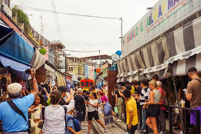 방콕에서 차로 약 1시간 거리에 위치한 매끌렁 시장은 '위험한 시장'이라는 별명답게 아슬아슬한 풍경을 연출한다. 선로 양쪽으로 자리 잡은 300여 개의 상점들은 하루에 네 번 기차가 오갈 때면 분주하게 차양을 걷고 매대를 정리한다. 느릿느릿 지나가는 기차와의 거리는 과장 조금 보태자면 벽에 바짝 붙어도 한 뼘 정도. 기념사진을 찍는 관광객들로 언제나 붐비지만 식재료와 생필품을 구매하는 현지인들도 많이 찾는 곳이다. 기차가 떠나자마자 매대와 그늘막이 순식간에 원상복구되는 모습도 재빠르고 유쾌하다.