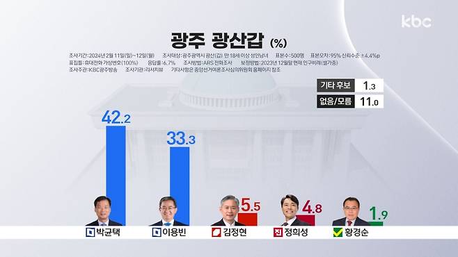 현역인 이용빈 민주당 국회의원은 33.3%의 지지율로 2위를 기록했고, 김정현 전 국민의힘 광주광역시당 위원장이 5.5%, 정희성 진보당 공동대표가 4.8%, 황경순 금호타이어노동조합 위원장이 1.9%로 집계됐습니다.