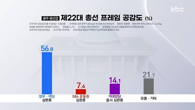 광주 광산갑 유권자들은 이번 총선의 프레임과 관련해 56.8%가 '정부ㆍ여당 심판론'에 공감한다고 답했고, 7.4%가 '586운동권 심판론'에 공감한다고 응답했습니다.