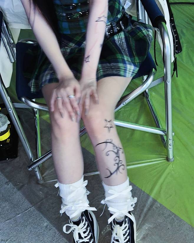 "진짜 타투야?"…카리나, 늘씬한 다리에 문신같은 스티커→팬들도 '깜짝'