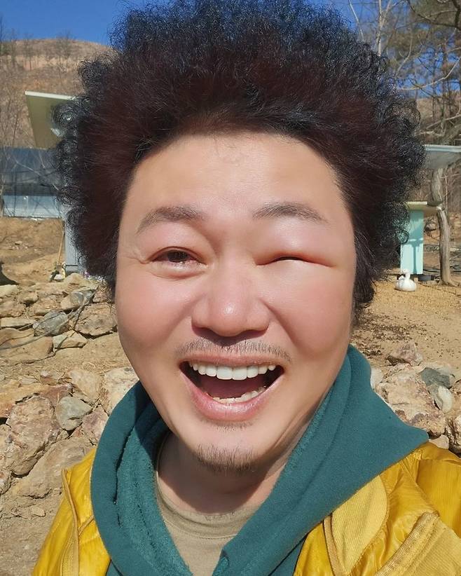 최근 윤택은 SNS를 통해 "아놔 ㅎㅎ 눈썹에 쏘였는데 하루 지나니까 이렇게까지 붓는다고? 천연 보톡스"라는 글과 함께 벌에 쏘여 눈이 부은 셀카를 공개했다.