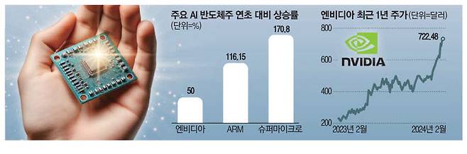 사상 최고가를 경신하고 있는 미국 주식시장을 인공지능(AI) 반도체 관련 주식들이 이끌고 있다. AI 반도체 대장주인 엔비디아는 12일(현지시간) 장중 일시적으로 구글(알파벳)을 제치고 미국 주식시장 시가총액 3위에 올랐다. 예상을 상회하는 실적을 발표한 ARM은 이날 29% 폭등했다.