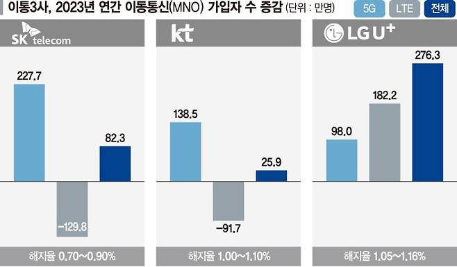 13일 이통3사의 2023년 연간 실적 보고서에 따르면 LG유플러스를 제외한 SKT와 KT의 지난해 무선 LTE 가입자 수(MVNO 제외)는 각각 129만8000명, 91만7000명 감소했다.