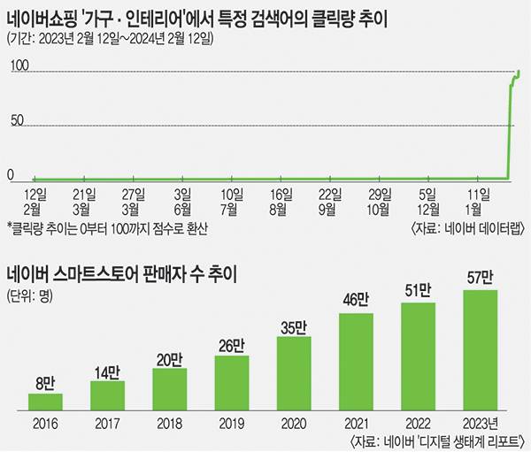 이 검색어는 지난해 2월부터 지난 4일까지 일일 클릭량이 ‘0’이었다가 지난 6일 88로 증가했고, 12일에는 최대치인 100을 기록했다. 네이버 데이터랩은 클릭량 추이를 0부터 100까지 점수로 환산해 공개한다. 같은 날 상위권에 오른 다른 검색어는 식탁 의자, 거실 테이블, 행거, 베개 등 평범한 단어들이었다. 수납기구 분야에선 ‘무타공 못이 필요없는 원목 벽선반 무지주’라는 검색어 역시 최근 한 달간 상위 26위를 차지하며 ‘미니 수납장’을 제친 사례도 있었다.