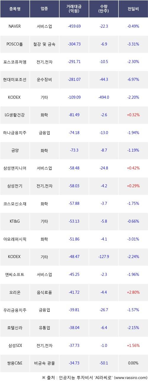 외국인 투자자의 순매도 상위 20개 종목은 NAVER, POSCO홀딩스, 포스코퓨처엠, 현대미포조선, KODEX 200선물인버스2X, LG생활건강, 하나금융지주, 금양, 삼성엔지니어링, 삼성전기등이다.