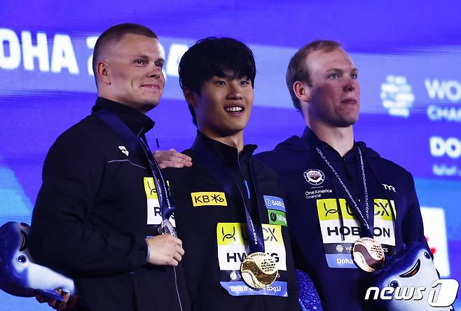 (로이터=뉴스1) 안은나 기자 = 황선우가 13일 오후(현지시간) 카타르 도하 어스파이어돔에서 열린 2024 세계수영선수권대회 경영 남자 자유형 200m 시상식에서 금메달을 목에 건채 은메달을 차지한 리투아니아의 다나스 랍시스(왼쪽), 동메달을 차지한 미국의 루크 홉슨과 기념 촬영하고 있다.