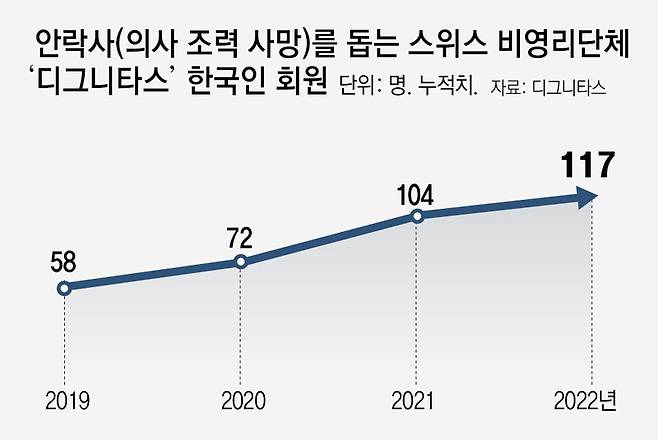이런 가운데 안락사를 위해 해외로 눈을 돌리는 국내 환자는 매년 증가하고 있다. 안락사를 돕는 스위스의 비영리단체 ‘디그니타스’에 가입한 한국인은 2022년 말 기준 117명으로 2019년 58명에 비해 3년 새 2배 이상으로 늘었다. 지난해 9월 디그니타스에 가입한 김모 씨(39)는 “뇌출혈을 겪은 이후 고통을 참기 어려워져 안락사가 가능한 나라로 떠나는 방안마저 고민하게 됐다”고 토로했다.