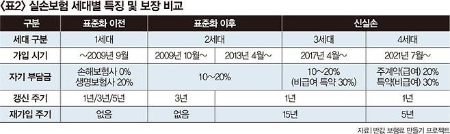 2022년 말 기준 가입자가 4000만 명에 달해 '제2 건강보험'으로 불리는 실손보험은 출시 시기와 보장 내용 등에 따라 1세대(구 실손보험), 2세대(표준화 실손보험), 3세대(착한 실손보험), 4세대로 구분된다(표2 참조). 금감원에 따르면 1세대 가입자는 820만여 명(20.5%), 2세대는 1912만 명(47.8%), 3세대는 956만 명(23.9%), 4세대는 232만 명(5.8%)이다.
