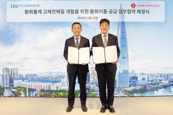 롯데에너지머티리얼즈(대표 김연섭·오른쪽)는 13일 서울 잠실 롯데월드타워에서 이수스페셜티케미컬(대표 류승호·왼쪽)과 황화리튬을 공급받는 내용의 업무협약(MOU)를 체결했다고 14일 밝혔다. 황화리튬은 황화물계 고체전해질의 핵심 원재료이다. 이번 계약으로 롯데에너지머티리얼즈는 양질의 고체전해질 샘픔을 국내외 전고체전지 기업에 공급할 수 있게 됐다.