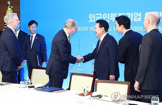 (서울=연합뉴스) 홍해인 기자 = 윤석열 대통령이 14일 서울 중구 대한상공회의소 챔버라운지에서 외국인 투자기업 대표들과 연 오찬 간담회에서 주한 유럽상공회의소 필립 반 후프 회장과 인사하고 있다. 2024.2.14 [대통령실통신사진기자단]