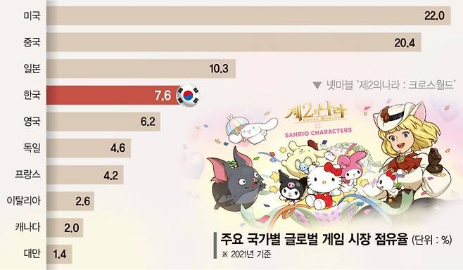 한국콘텐츠진흥원의 '2023년 중국 게임시장 트렌드'를 보면, 2022년 중국의 연간 게임시장 매출액은 2658억8400만 위안으로 약 49조원에 달한다. 콘텐츠진흥원은 '2022년 대한민국 게임백서'에서 2021년 기준 글로벌 게임 시장 내 중국 점유율을 20.4%로 글로벌 2위로 파악했다.