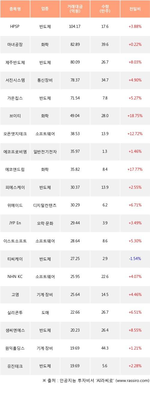 HPSP, 마녀공장, 제주반도체 등은 전일 대비 주가가 상승했고, 티씨케이 등은 주가가 하락했다.