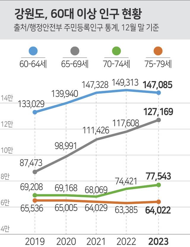 14일 본지가 행정안전부의 주민등록인구통계를 분석한 결과, 2023년 말 기준 60대 이상 인구는 51만2812명이었다. 2019년 말(43만2069명)보다 18.7%(8만743명)나 증가했다. 관심을 끄는 것은 60대 인구의 증가다. 지난 해 말 강원지역 60대 인구는 27만4254명이었다. 70대 이상 전체인구(23만8558명)보다 3만5696명 많았다. 60대 인구는 2019년 12월 말(22만502명)보다 5만3752명이나 증가했다.