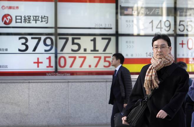 | ▲ 지난 2월 13일, 일본 도쿄의 한 도쿄 주식 시장 표시판을 행인들이 걸어가고 있다. 도쿄 주식 시장은 1000포인트 이상 상승하며 34년 만에 최고치를 경신했다. 이날 닛케이 평균 주가는 2.89% 상승한 37,963.97로 마감하여 1990년 1월 이후 최고치를 기록했습니다. |