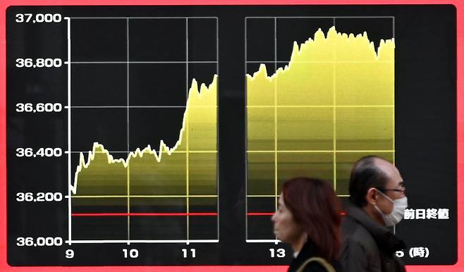 | ▲ 지난 2월 8일 도쿄의 한 거리에 도쿄 증권거래소의 일일 주가 움직임 차트가 전광판에 표시되어 있습니다. 이날 도쿄 주식은 기술주 상승에 힘입어 급등했다. |