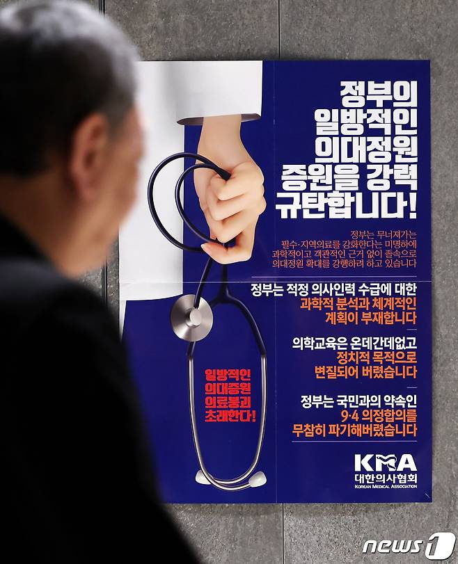 (서울=뉴스1) 박지혜 기자 = 15일 오전 서울 용산구 대한의사협회에 정부의 의료개혁을 반대하는 포스터가 붙어 있다.