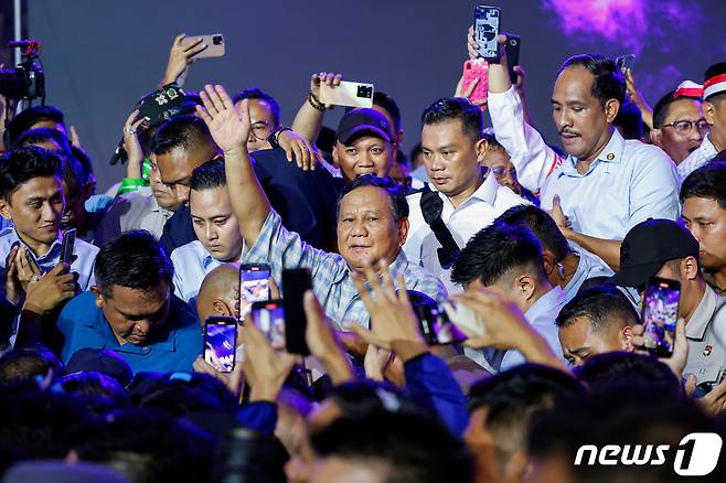 (자카르타 로이터=뉴스1) 우동명 기자 = 인도네시아 대통령 후보인 프라보워 수비안토가 14일(현지시간) 자카르타에서 대선 승리를 한 뒤 지지자들과 기뻐하고 있다. 2024.2.15