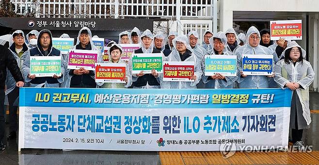 (서울=연합뉴스) 서대연 기자 = 양대노총 공공부문 노동조합 공동대책위원회 관계자들이 15일 오전 서울 종로구 정부서울청사 앞에서 공공노동자 단체교섭권 정상화를 위한 국제노동기구(ILO) 추가제소 기자회견을 열고 있다.